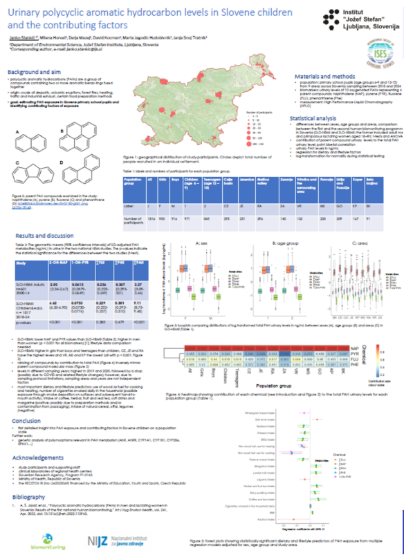 Janko’s award-winning poster, “Urinary polycyclic aromatic hydrocarbon levels in Slovene children and the contributing factors,” examined urinary PAH metabolites in 1,816 Slovenian children as part of the SLO-HBM II programme. His research identified elevated NAP and PYR metabolite levels compared to previous adult datasets, as well as distinct exposure clusters in industrial and high-traffic regions. Lifestyle factors such as household biomass combustion, environmental tobacco smoke, and diet were also shown to significantly influence PAH levels.