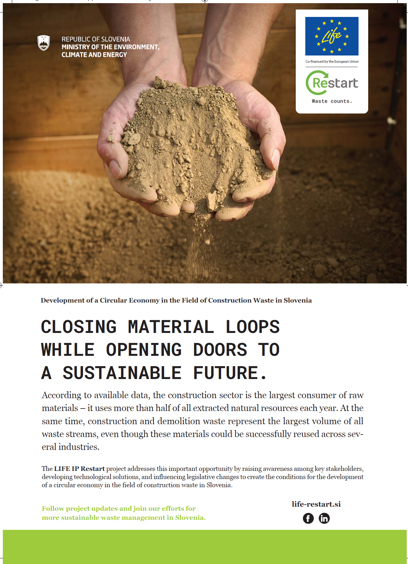 The leaflet highlights how LIFE IP Restart is creating the conditions for a circular economy in the field of construction waste in Slovenia. With construction and demolition waste representing the largest share of all waste streams, the project focuses on practical solutions, legislative improvements, and collaboration with key stakeholders.